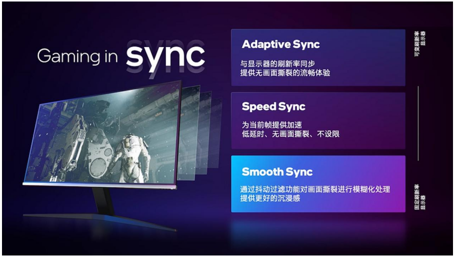 这次锐炫显卡还带来了一项比较实用的游戏黑科技Smooth Sync。显卡本身支持Adaptive Sync、Speed Sync和Smooth Sync三种同步技术,Adaptive Sync自适应同步是最常见的同步防撕裂模式,和显示器的刷新率同步;Speed Sync则可以对当前帧进行加速,有效避免画面撕裂并提供更低的帧延迟,且不受帧率限制;Smooth Sync则通过抖动过滤的方式对画面撕裂进行模糊化处理,从而实现画面撕裂情况的消除。