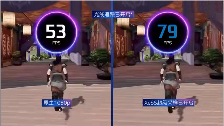 这里简单介绍一下Intel家的XeSS技术,它也是通过将低分辨率渲染的图像拉伸到高分辨率输出,让玩家可以同时享受到更高的游戏帧率和更精细的游戏画面,而这个过程是可以通过Xe-HPG架构中Intel XMX引擎的硬件加速和AI运算来完成的,4K分辨率下所耗的资源还不到原生渲染量的一半,可以说是非常高效的。Intel的发布视频中使用了《天涯明月刀》来演示光追+XeSS的效果,开启之后帧率超过70fps,玩起来的流畅感不错。此外,XeSS本身也符合DP4a标准,也可以运行在没有Intel XMX引擎和硬件AI单元的显卡上,所以其它家的显卡也是可以享受的。