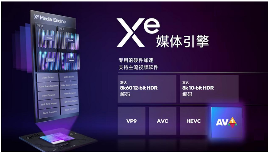除了游戏应用,锐炫显卡也同样考虑到了内容创意设计用户的需求,Xe媒体引擎不但支持8K/60fps 12bit HDR的硬解码,也支持8K 10bit HDR的硬件编码,同时对主流的H.264/H.265/AV1/VP9都提供了硬件编解码支持,在主流视频软件中即可调用,这一点还是非常厚道的,毕竟在千元显卡中,有些竞品已经砍掉了4K/H.264/H.265硬件编码和AV1硬件解码的功能。