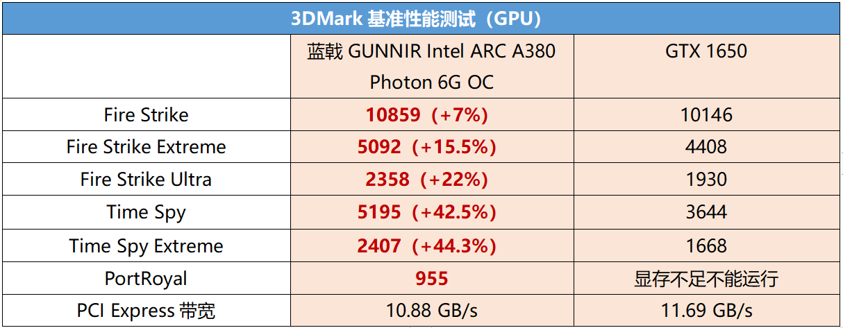 首先看看基准测试部分的情况,我们选择了一款目前售价为1499元的GTX 1650 4GB显卡进行对比。从3DMark各项GPU基准测试的情况来看,蓝戟GUNNIR A380 Photon的表现可以说是令人非常惊喜,在FireStrike这样的DX11测试项中相比价格贵出469元的GTX 1650强7%~22%,而在DX12项目中更是强了42.5%~44.3%,可见Xe-HPG架构的硬件规格还是非常到位的,对于DX12的优化也更深入一些,而PortRoyal光追测试更是硬性优势所在,毕竟锐炫A380不但拥有硬件级光追加速,6GB显存也达到了光追游戏的入门标准,未来加上XeSS的支持,流畅运行光追游戏也并不是难事。