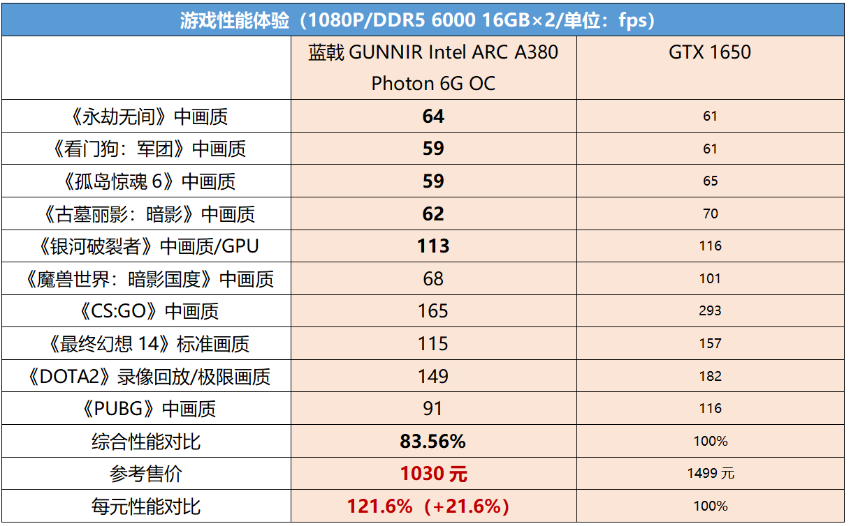 综合来看,蓝戟GUNNIR A380 Photon的游戏性能大致相当于GTX 1650的83.56%,如果仅考虑DX12游戏,应该能达到GTX1650的90%,不过加上价格的因素,蓝戟GUNNIR A380 Photon每元性能应该比GTX 1650更高,因此从性价比来讲,蓝戟GUNNIR A380 Photon还是比GTX 1650更有优势的。