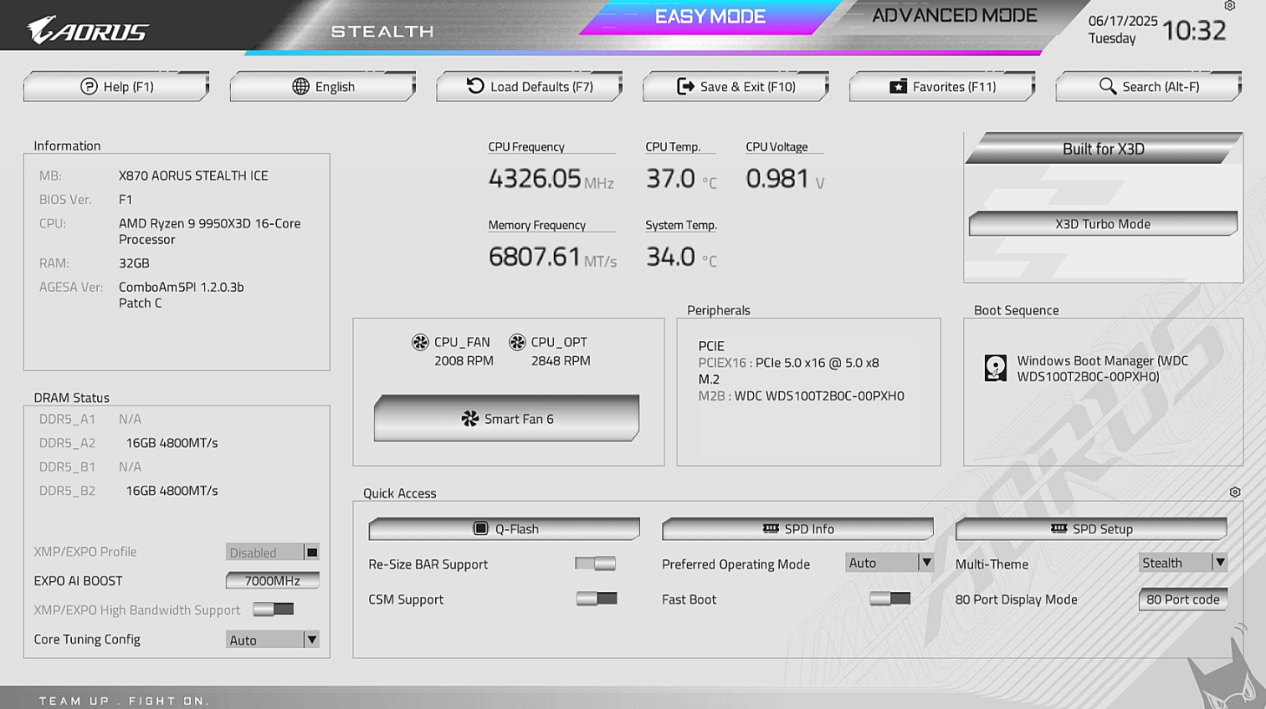 可以看到,在X870背插冰雕的BIOS中打开X3D Turbo Mode功能之后,锐龙9 9950X3D从16核32线程变成了8核8线程,而三级缓存则是96MB(64MB+32MB),可见其启用的正是搭载了64MB 3D V-Cache缓存的那个CCD。