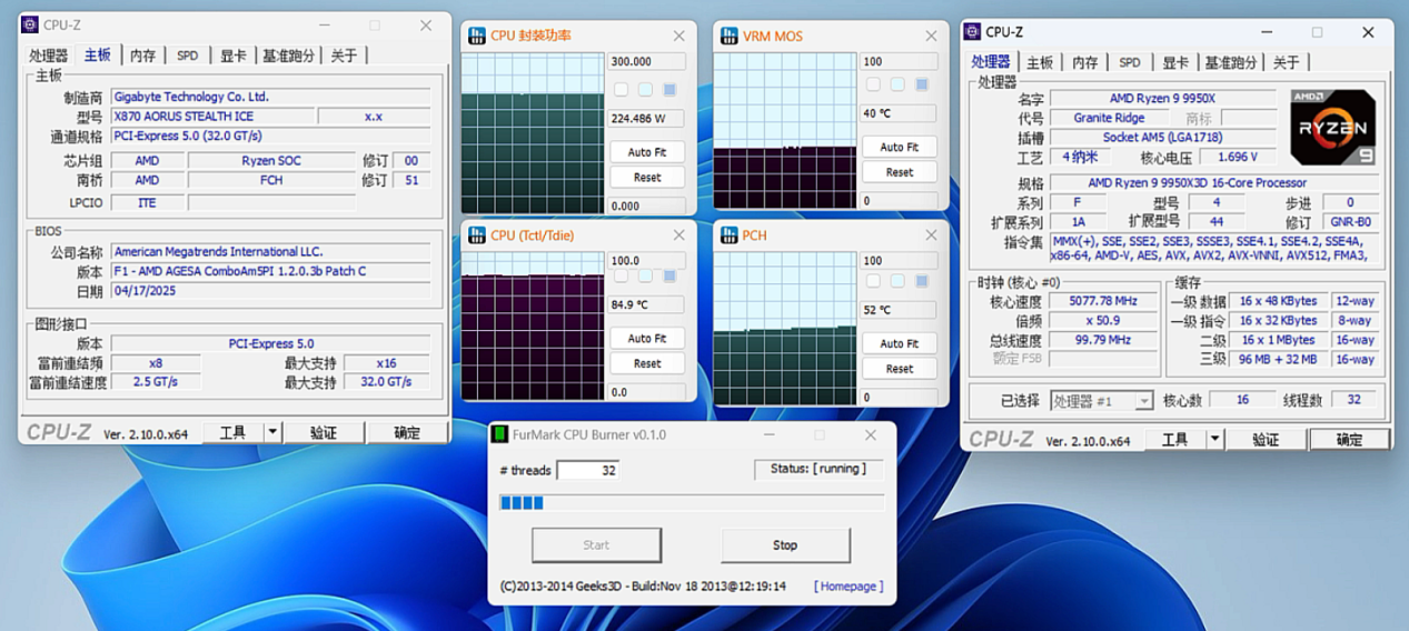 首先看看X870背插冰雕搭载锐龙9 9950X3D这样的旗舰U满载时的功率表现。可以看到,锐龙9 9950X3D满载考机时的封装功率大约为225W,在环境温度27℃和这样的供电需求下,X870背插冰雕的VRM MOS考机温度仅有40℃,可见如此豪华的供电规模与散热设计就算是面对锐龙9 9950X3D这样的旗舰U也是毫无压力的。