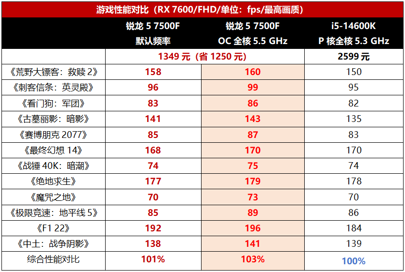 即便是在默认频率下,锐龙5 7500F在游戏中的表现也能和i5-14600K打得有来有回,还平均领先1%。要是将锐龙5 7500F的频率提升到全核5.5GHz,在此频率下,该处理器在所有游戏中的成绩均实现了领先,综合领先幅度为3%。