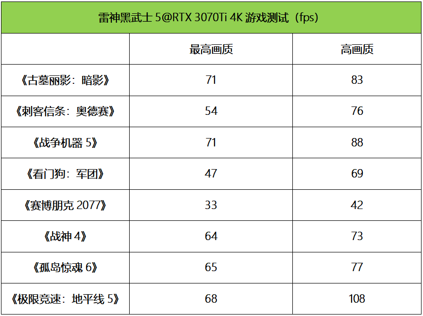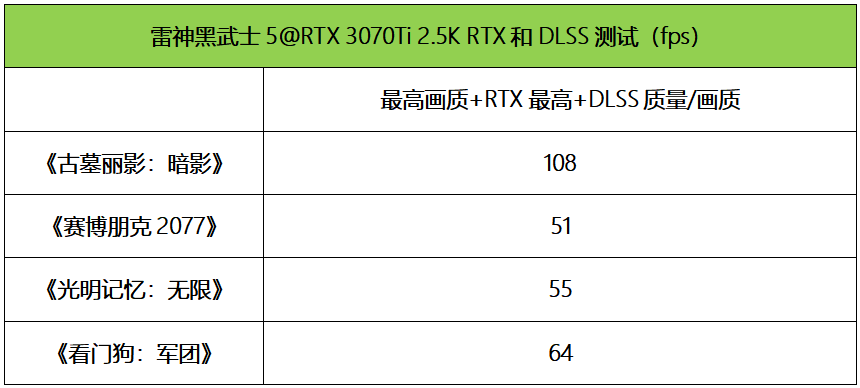 考虑到RTX 3070Ti的定位和性能表现,在游戏实测中,我们分别测试的是雷神黑武士5在2.5K(2560×1440)和4K(3840×2160)分辨率下的游戏平均帧速。