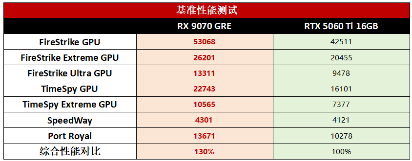 综合来看,RX 9070 GRE在基准性能测试中的跑分表现全面领先于RTX 5060 Ti 16GB,综合成绩领先幅度达到了30%,这是相当大的差距了。