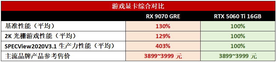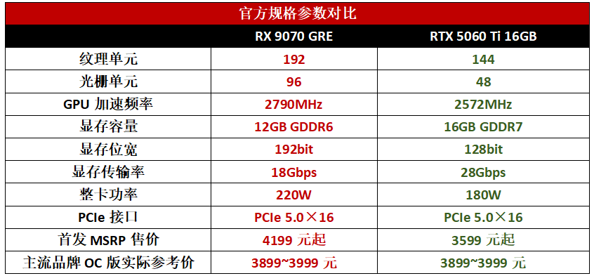 通过规格的对比,RX 9070 GRE和RTX5060 Ti 16GB在定位、功能以及价格等方面都是基本相同,该如何选择就得全看在游戏中的表现了。