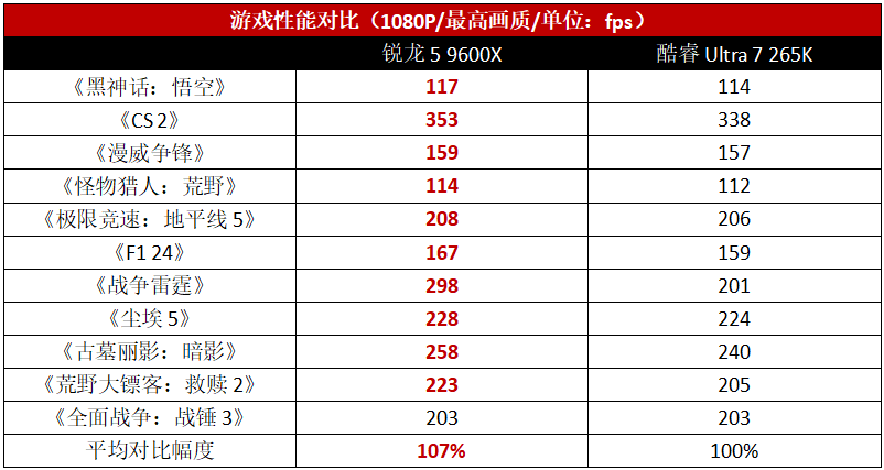 锐龙5 9600X就算是越级面对酷睿Ultra 7 265K在多数游戏中也能做到完胜,其中在《战争雷霆》中的领先幅度最大,达到了48%,在《荒野大镖客:救赎2》和《古墓丽影:暗影》中,领先幅度也在7%以上,优势可谓是相当明显。而且就算是《全面战争:战锤3》,两款CPU都获得了203fps的平均游戏帧率基本可以说打成了平手。