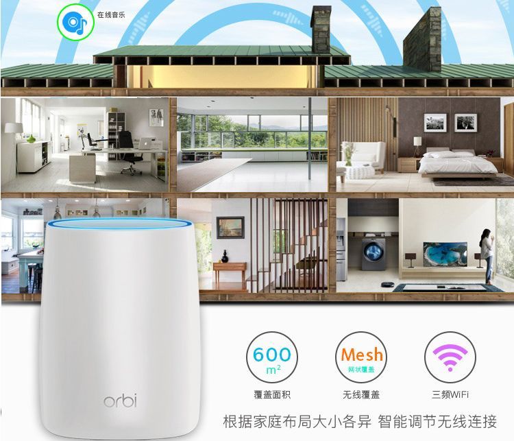 网件 Orbi RBK53这样的产品1个主路由器+2个扩展路由器号称就能实现600m2别墅的网络覆盖