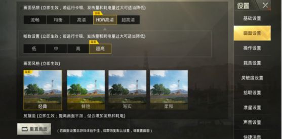 接下来是热门IP吃鸡手游,我们选择了官方授权的正版游戏《绝地求生:刺激战场》,这也是华为特别优化过的一款游戏。在设置中开启“HDR高清”和“超高帧数”,其他选项保持默认。最后的“流畅自适应”选择为“关闭”,以免影响测试结果(该功能会根据流畅度自动调节帧数)。