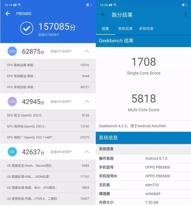 R17的一些跑分数据,搭配满血的8GB运存,安兔兔跑分成绩15万7千分印证了15%的提升数据,Geekbench单核跑分1708,多核跑分5818,可以看出单核性能方面的提升,多核性能则与骁龙710相当