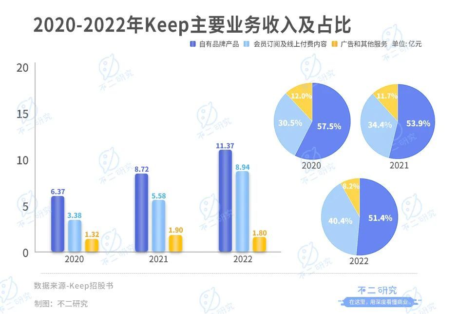 值得注意的是,作为keep最大的收入源,其自有品牌的毛利率近三年却在持续下降,一直未超过40%。2020-2022年,keep的总体毛利率分别为45.1%、41.8%、40.7%,也呈现下降趋势。