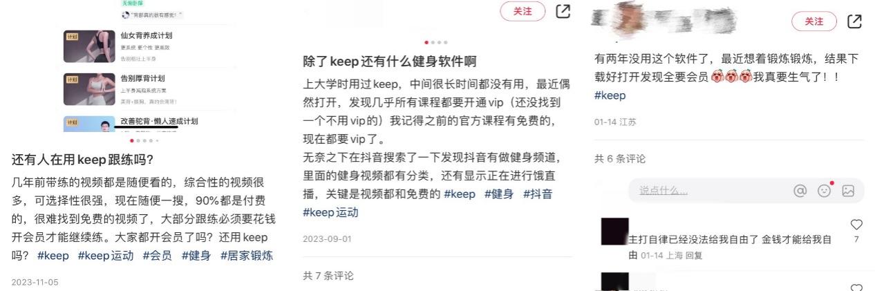 从小红书等社交媒体平台,也能看出,不少用户并不愿意为线上健身课程付费。有不少用户提到,“几年前带练视频都是随便看,现在90%都是付费的,很难找到免费视频了”“有两年没用这个软件了,最近想锻炼锻炼,结果下载好打开发现全要会员,我真要生气了”……