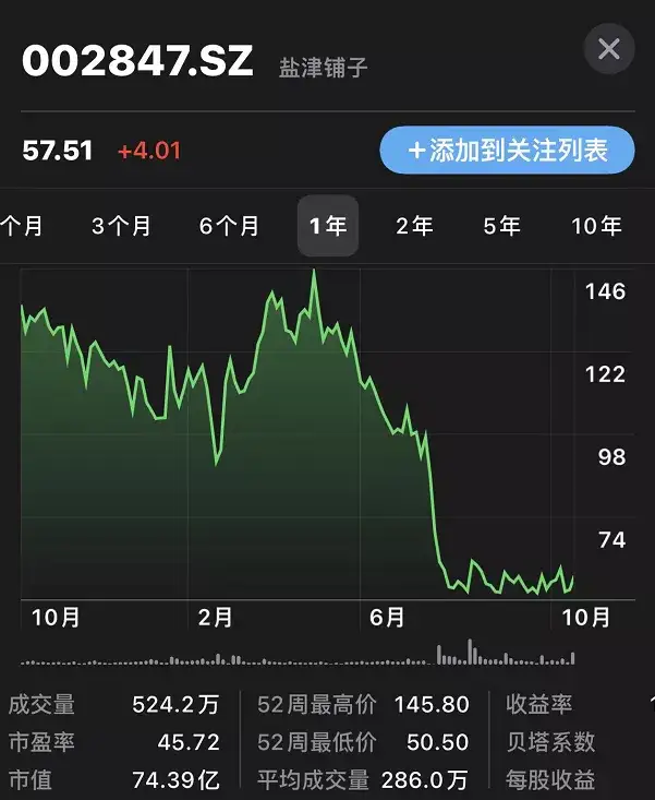 对此,二级市场反应剧烈。自2021年4月末以来,盐津铺子的股价一路下跌,甚至还在7月15日、16日、19日和20日的4个交易日,股价连续跌停。截至2021年10月22日,盐津铺子与7月中旬相比,股价最高跌幅已达48.5%。