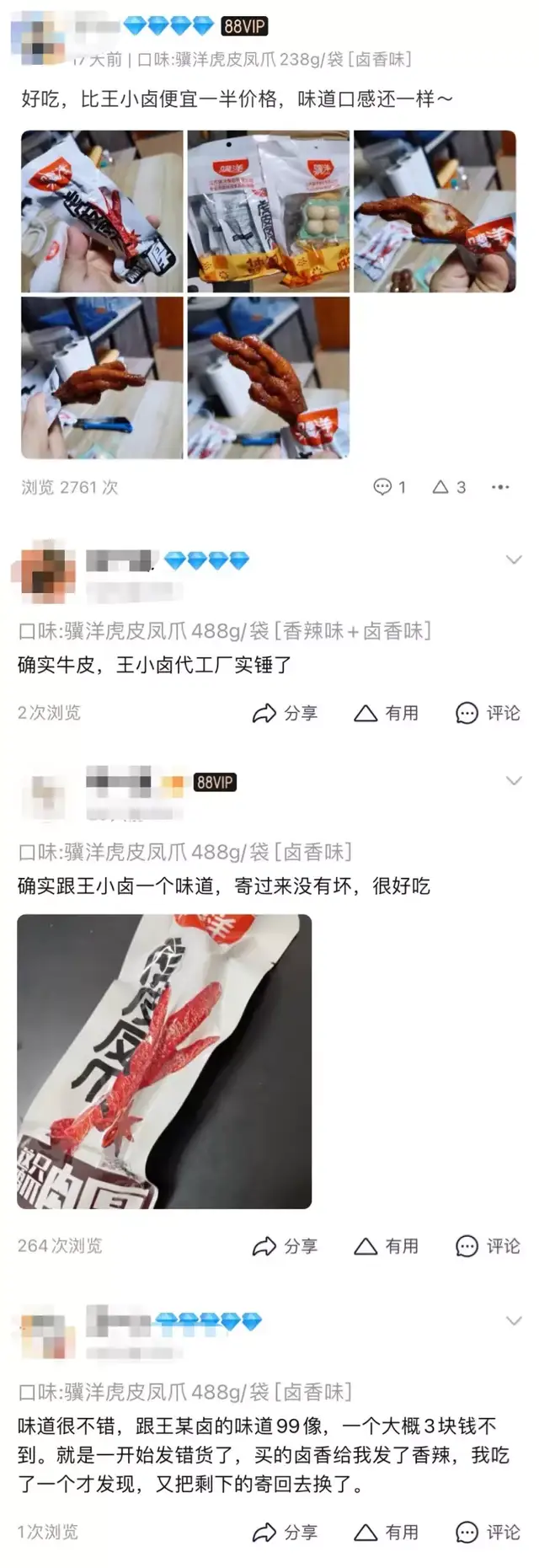 零食爱好者敏琪告诉锌刻度,以王小卤的网红凤爪产品为例,算起来一个凤爪就要五块多,而她找到的代工厂品牌骥洋,其凤爪平均下来一个才两块多,“直接找代工厂真的便宜太多了,反正都是同一家的货,口味基本没差。”