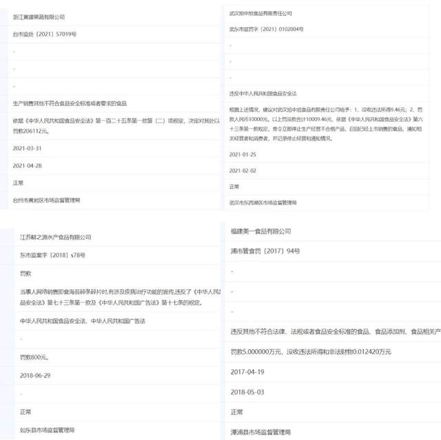 具体来说,为小鹿蓝蓝提供“宝宝鲜鲜虾片”代工的武汉旭中旭食品有限责任公司,在2021年1月25日被武汉市东西湖区市场监督管理局罚款10000元,并责令立即停止生产经营不合格产品,召回已经上市销售的食品,通过相关经营者和消费者,并记录停止经营和通知情况。