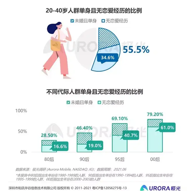 尽管拥有交友意向,但事实上“母胎SOLO”的年轻人比例并不低。据极光调研结果显示,处于适婚年龄(20-40岁)的人群中,有55.5%的人目前为单身状态,其中更有34.6%的人从未谈过恋爱。