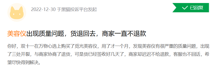 锌刻度在消费者投诉平台“黑猫投诉”上看到,共有近2000条投诉与美容仪相关,而其中不乏提到国产品牌:“消费者购买全新觅光美容仪pro,觅光发给客户明显有使用痕迹的货品给客户,并且仪器表现有明显划痕。”、“用了之后(美容仪的)头裂开了却不能退,只能换。用在脸上的东西裂开了你还敢再继续用吗?”、“双十一在万物心选上购买了觅光美容仪,用了才一个月,发现美容仪有很严重的质量问题,出现了三处开裂”……