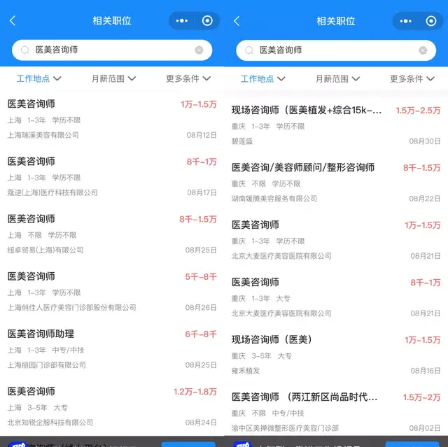 锌刻度查询发现,很多医美公司的医美咨询岗位,就职条件不高,单位对应聘者都没有学历要求,也很少设置医学或护理学等专业门槛,反而更加看重销售、沟通交际等能力。