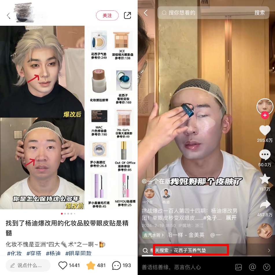 相比前期的视频,在“爆改杨迪”的这期视频当中,也出现了类似植入的情况。在给杨迪上底妆时出现了花西子底妆产品的特写,视频相关搜索更显示“花西子玉养气垫”。