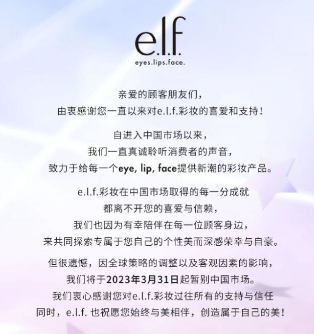 (以平价出圈的e.l.f.也宣布退出中国市场)
