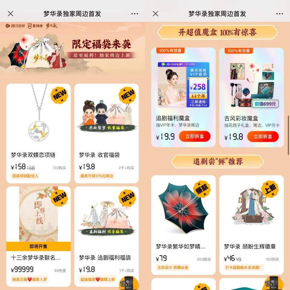 另外腾讯视频还在点映礼界面设置了“《梦华录》独家周边首发”,包括售价158元的双蝶恋项链、售价19.8元的收官福袋、售价25.9元的白头书签、售价59元的官方定制团扇、售价35.9元的枕梦书签以及晴雨伞、徽章、口罩、钥匙扣等多款《梦华录》周边产品。