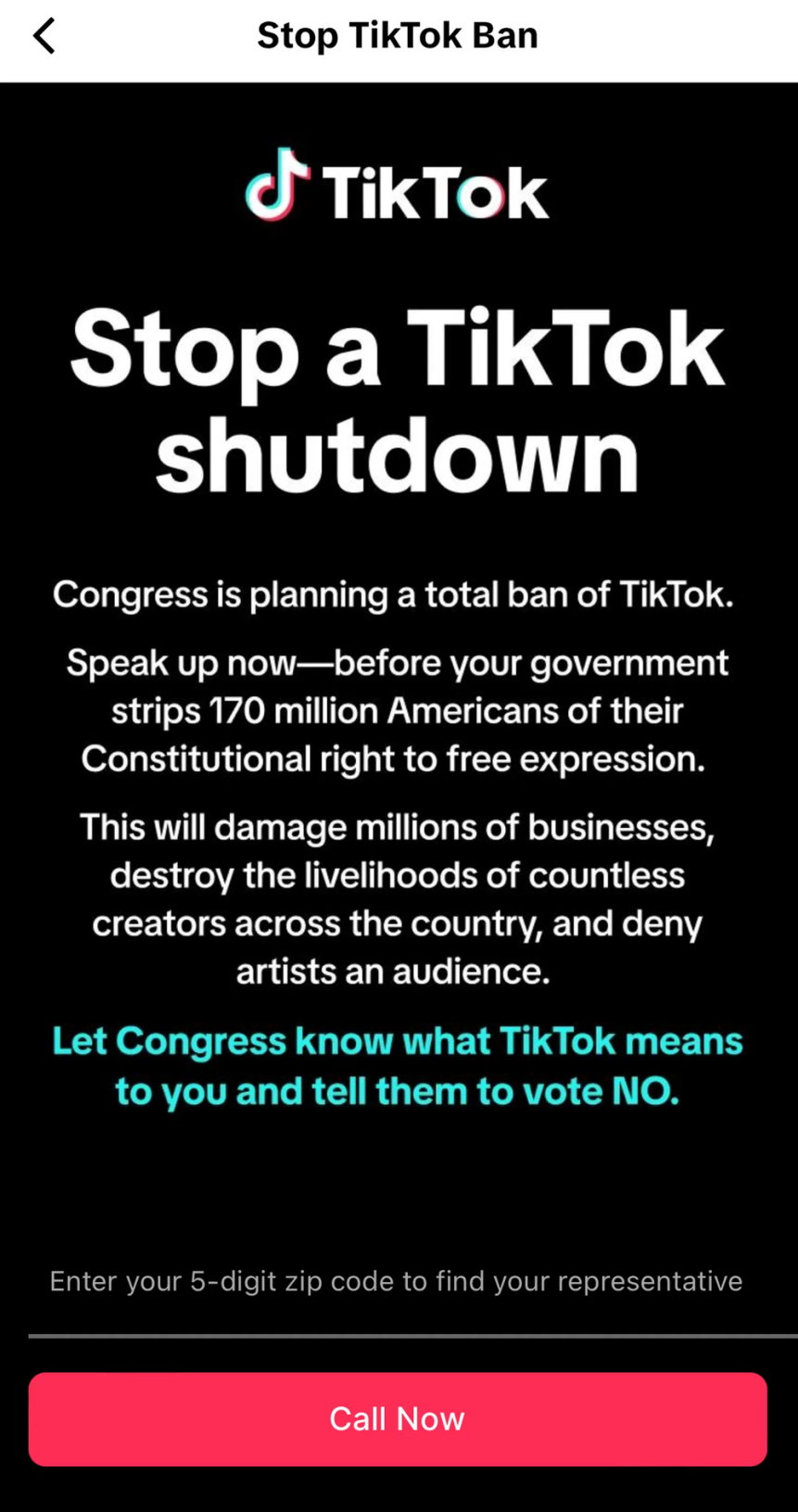 显而易见,这触及了TikTok的“底线”,不得不行使其合法权利来阻止禁令,在美国众议院表决之前,向18岁及以上的用户推出了弹窗消息:“阻止TikTok被关停”“让国会知道TikTok对你意味着什么,让他们投否决票!”
