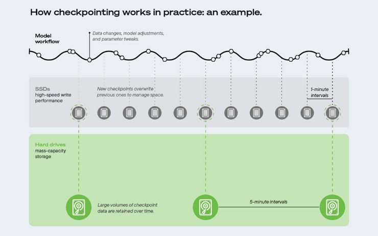 模型训练期间的数据保留呈现出明显的阶段性特征。如图所示,模型工作流程会持续生成数据变更和参数调整,高速SSD会频繁执行快速检查点写入,同时覆盖先前的数据以满足实时性要求。这种高频覆盖机制可确保高效的训练进程,这意味着活跃的训练数据通常仅保留几分钟。相比之下,大容量HDD则承担着长期存储的职责,将海量检查点数据集保存数周甚至数月,从而维护全面的历史档案。
