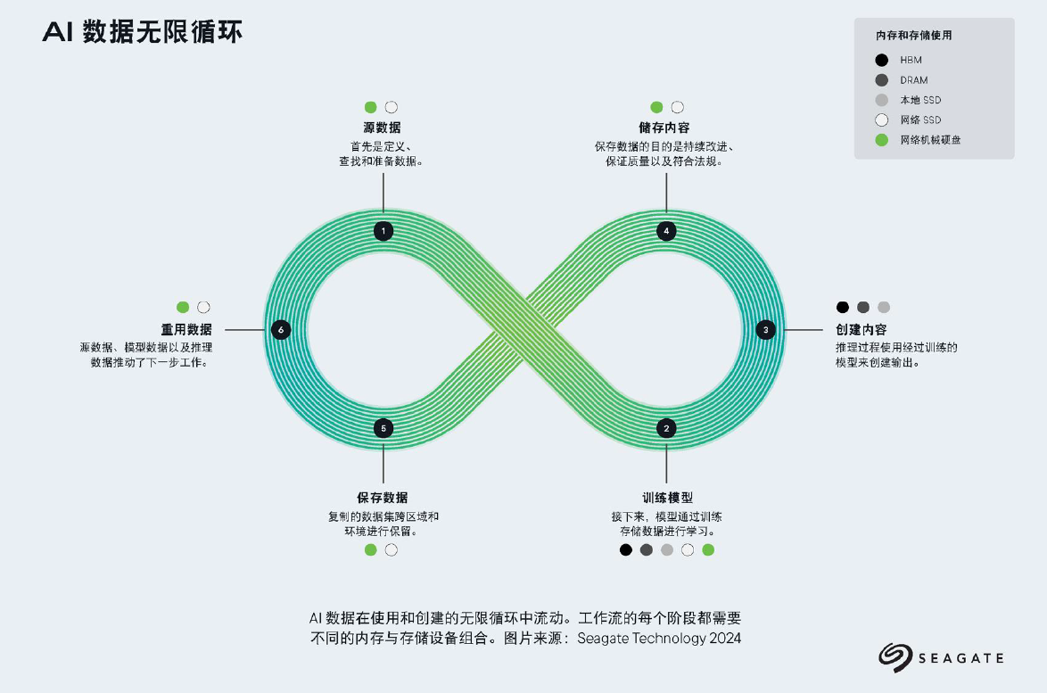 数据已成为AI成功的核心要素,其在希捷提出的“AI数据无限循环”中流经六大节点:源数据、训练模型、创建内容、存储内容、保存数据和重复利用数据。每个阶段都需要差异化的存储方案组合: