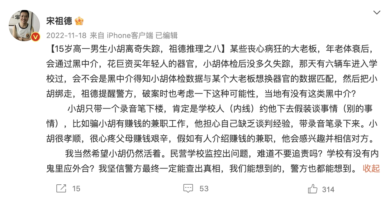 今年2月,胡鑫宇事件发布会后,微博官方立刻发布视频称胡鑫宇阴谋的源头在短视频,有一众微博大v鼓吹微博管理得当。忙着监督短视频的微博可能并没有注意到,最早在去年11月的时候就把各种谣言正儿八经引入舆论场的,是微博大V宋祖德。并且在整整造谣109天后,宋祖德才被微博禁言。源头究竟在哪儿,很明显。
