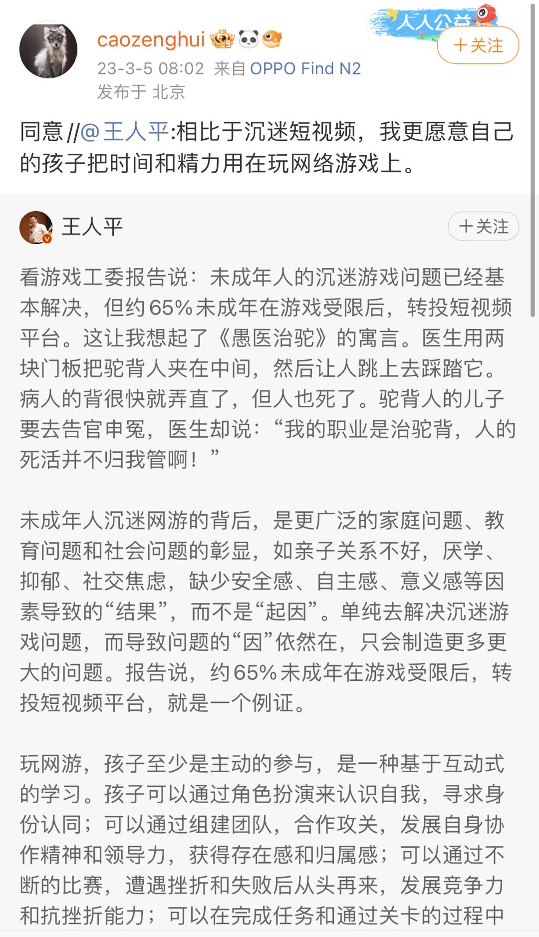 这条微博的原作者、育儿大V“王人平”认为,未成年人打网络游戏都是家长没有陪伴好,打游戏还有利于孩子认识自我、培养团队精神。王人平在这条微博火了之后,又转发了一遍,称宁愿孩子玩游戏也不愿意孩子看短视频。
