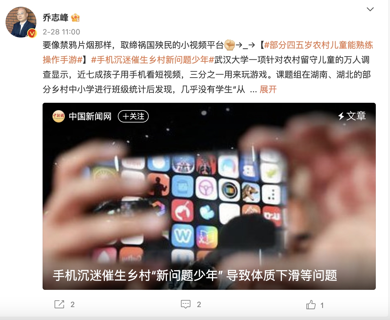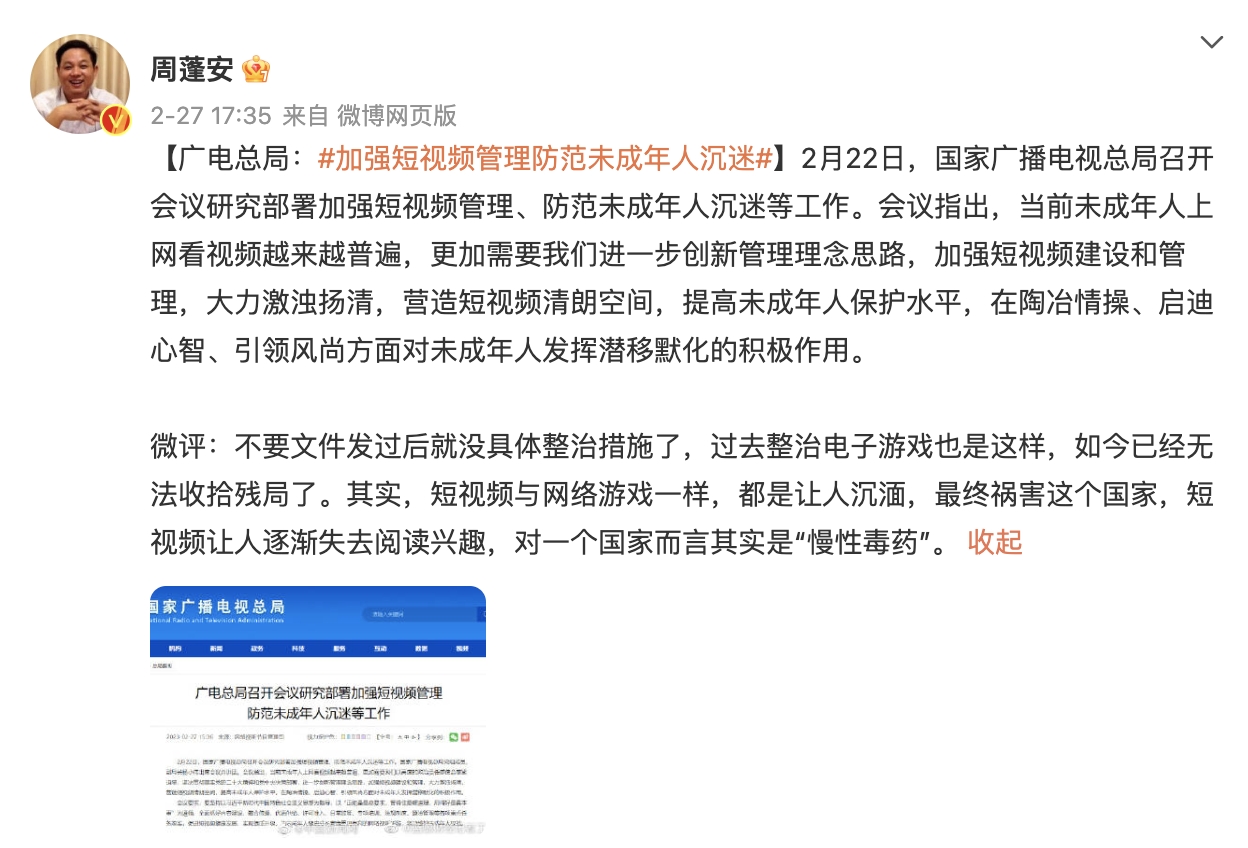 无独有偶,就在不久前,微博上频频出现与“短视频有害”的文章,不少微博金V甚至下场鼓吹,乃至要求直接关停短视频,仿佛不置短视频于死地不能解心头之恨。一时间,“反短视频”似乎成了微博上的政治正确。