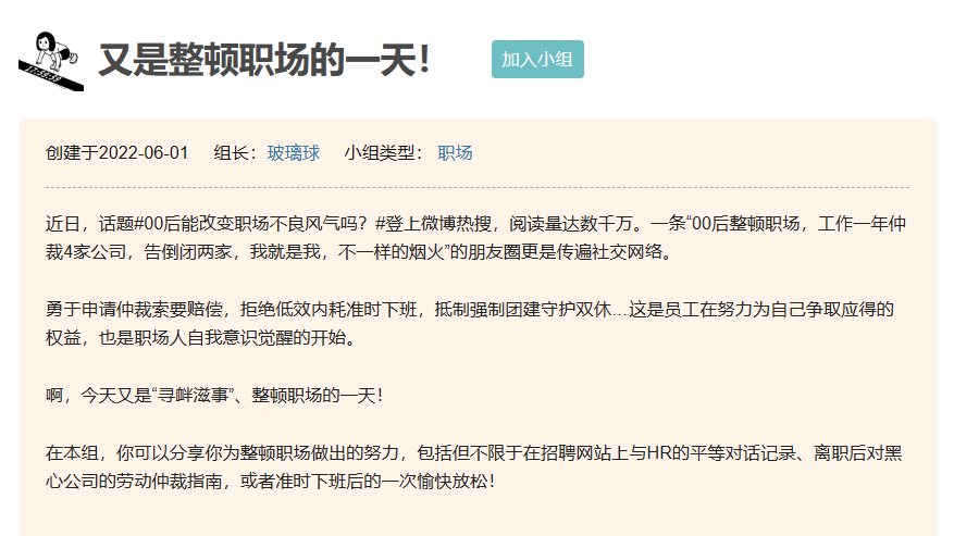 锌刻度留意到,在社群媒体软件豆瓣上,一个名为“又是整顿职场的一天!”的小组创建不到一年,已经有近5000名组员,并自称为“自由的螺丝钉”。而这个小组的简介写道,“勇于申请仲裁索要赔偿,拒绝低效内耗准时下班,拒绝强制团建守护双休…这是员工在努力为自己争取应得的权益,也是职场人自我意识觉醒的开始……在本组,你可以分享你为整顿职场做出的努力,包括但不限于在招聘网站上与HR的平等对话记录、离职后对黑心公司的劳动仲裁指南,或者准时下班后的一次愉快放松!”