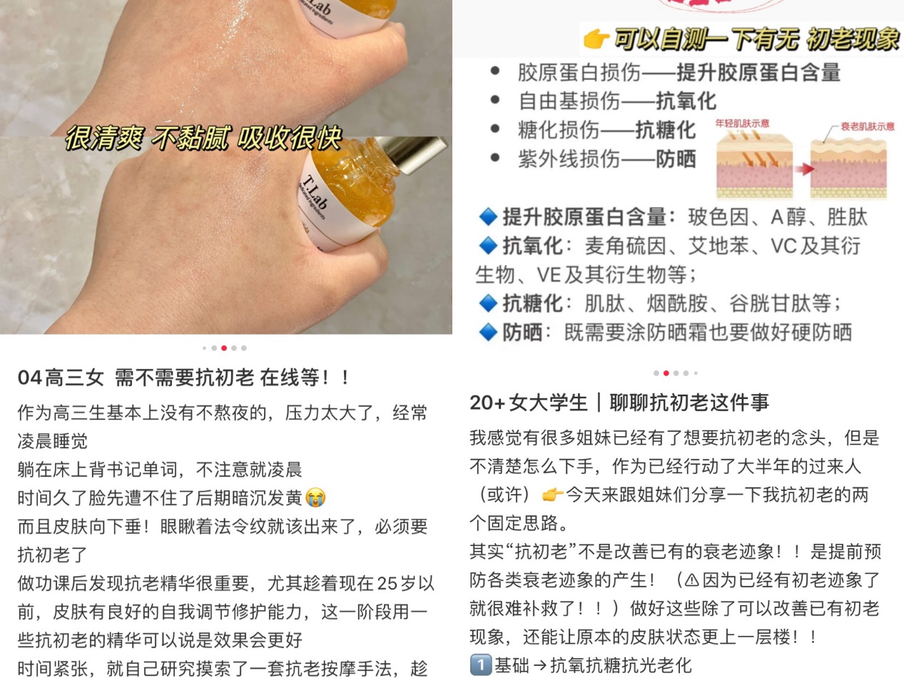 桃桃的担忧并非空穴来风,在小红书等社交媒体平台,已有诸多女大学生分享抗衰经验。其中不乏“04高三女,需不需要抗初老?”、“穷鬼女大学生21岁就有小细纹了,不抗衰不行了”之类的笔记出现。