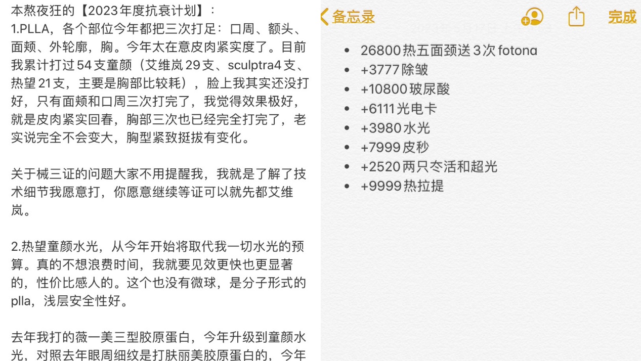 (左为博主的抗衰计划,右为田雪怡的医美花费)
