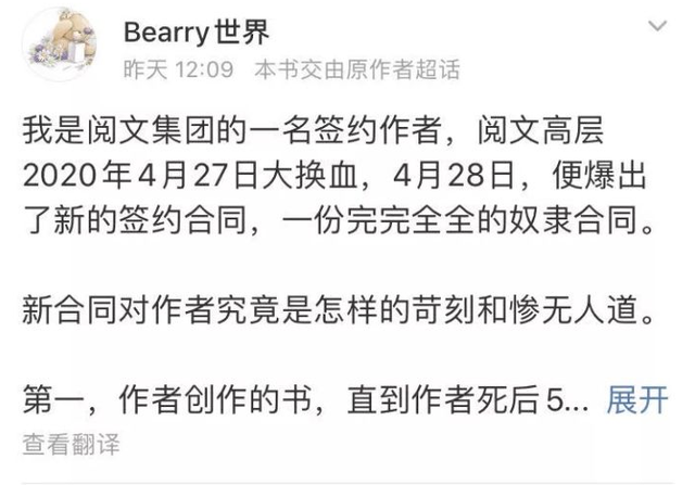 在2020年5月份,微博一位叫Bearry世界的博主爆料,认为阅文与作者签约合同沦为“奴隶合同”,由此引发了一次行业巨大动荡。