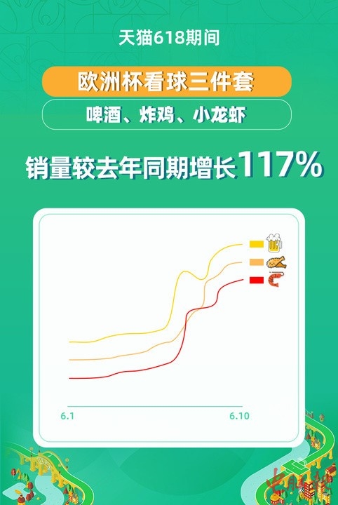 618期间,巨大的流量还为各大商家引爆了足球消费热潮——天猫618各国球队的球衣销量同比增长18倍;酒、炸鸡、小龙虾组成的“欧洲杯看球三件套”较去年同期暴涨117%;因比赛时间大多数时段为深夜,仅开赛周就有138万人上天猫搜耳塞……