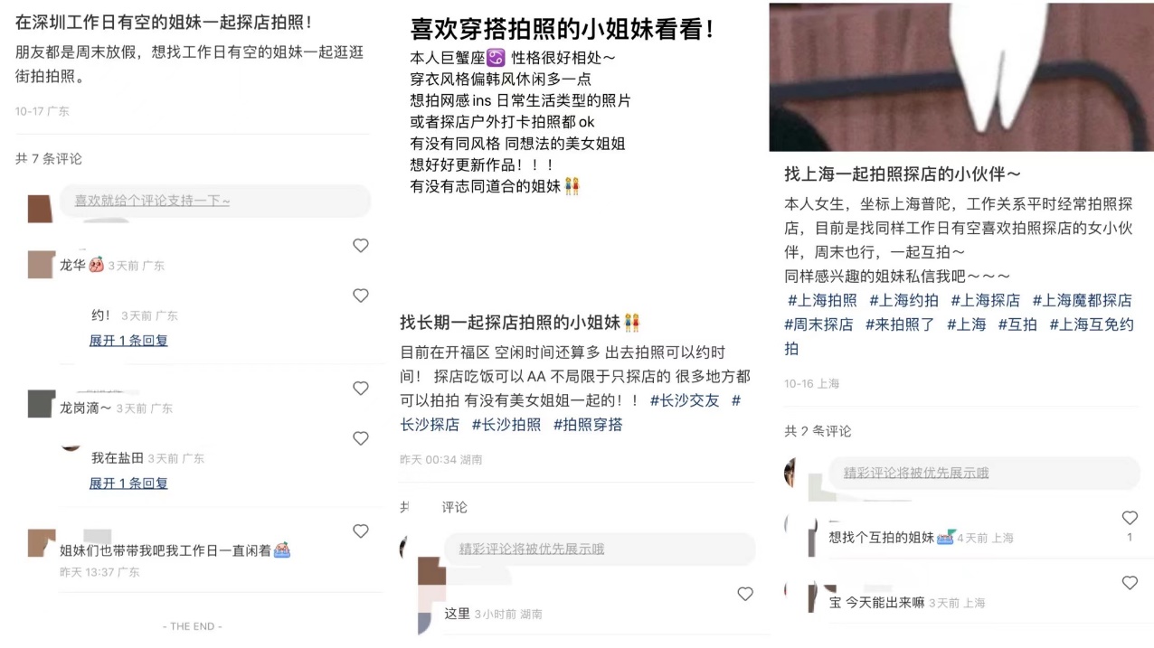 锌刻度留意到,在小红书等平台,已经有不少网友开始发帖寻找同城一起探店拍照的朋友,“朋友都是周末放假,想找工作日有空的姐妹一起逛逛街拍拍照”、“想拍网感ins、日常生活类型的照片,或者探店户外打卡拍照都可以”、“想找一起拍照探店的伙伴,一起互拍”……