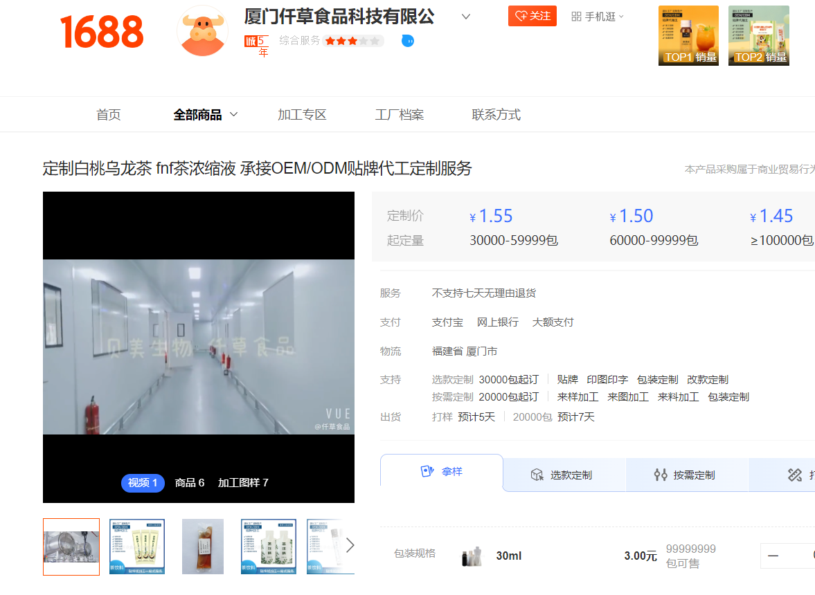 其中,fnf的代工厂为厦门仟草食品科技有限公司。锌刻度在工厂货源供应电商平台搜索发现,厦门仟草承接的贴牌代工定制服务的产品目录中包括定制白桃乌龙茶fnf茶浓缩液,按需定制价为1.46元-1.55元一包,可“来样加工、来图加工、来料加工和包装定制”。而fnf的官方售价为5,99元一袋,身价几乎翻了两倍。