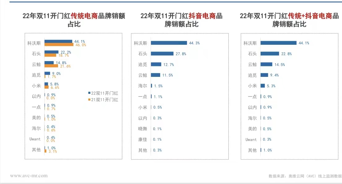 据奥维云网的数据显示,2022年双十一开门红数据,科沃斯以44.1%的份额无可争议地排在第一,其后是米家三雄(36.9%)以及云鲸,行业前五之外的品牌份额均不及1%。