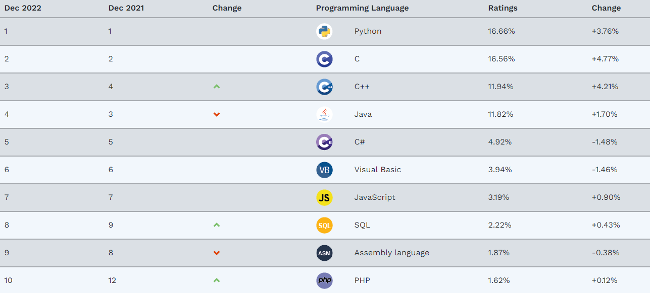 日前,被誉为编程语言界“江湖百晓生”的TIOBE发布了2022年12月的编程语言排行榜,Python、C语言与C++位列榜单前三,而Java仅排名第四。