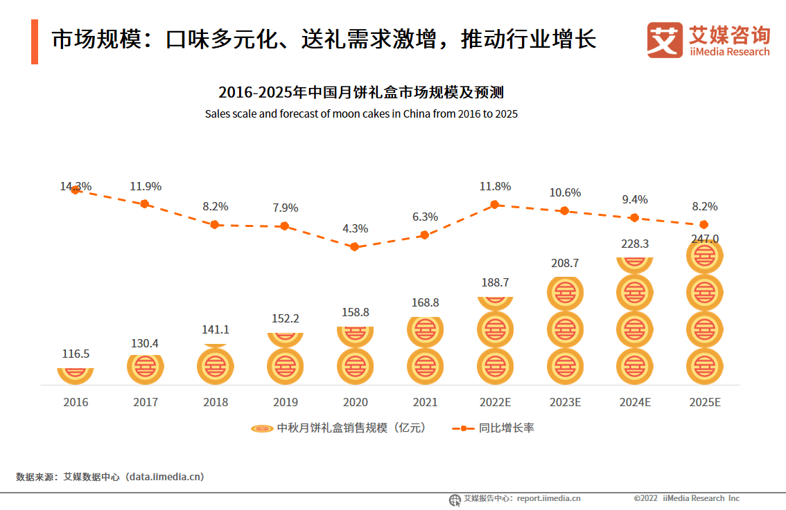 有信息显示,月饼的毛利率在50%以上,不少月饼厂商一年仅卖一个季度,便能达成全年销售总目标。另据艾媒咨询数据显示,2022年中国月饼礼盒销售额达到188.7亿元,同比增长11.8%,2025年将达247.0亿元。