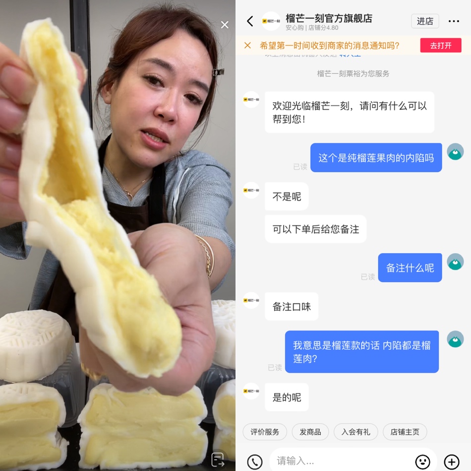近期,一度走红于各大平台直播间的榴芒一刻旗下一款榴莲冰皮月饼遭到大范围的消费者投诉。“一时听信了主播的说辞,结果买到手根本就是几块冰皮绿豆糕,但主播带货的时候压根没提到馅料大部分是绿豆沙。”23岁的吴珺馨原本是一个对所有月饼都无感的人,但因为喜欢吃榴莲,才决定下单试试水,没想到直接“翻了车”。