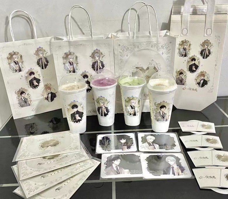 据喜茶微信公众号在3月13日发布的《喜茶×光与夜之恋丨纯白誓约,喜悦相恋》一文,喜茶在本次联名中制作了联名定制角色饮品杯、联名定制画框杯套、联名定制纸袋&保温袋以及游戏中萧逸、陆沉、齐司礼、查理苏、夏鸣星五位男主角的人物透卡、联名喜证。与此同时,全国还有7家定制主题门店能够提供“喜证压印”的特别服务,用玩家的话来说,“这和谈了有什么区别”。