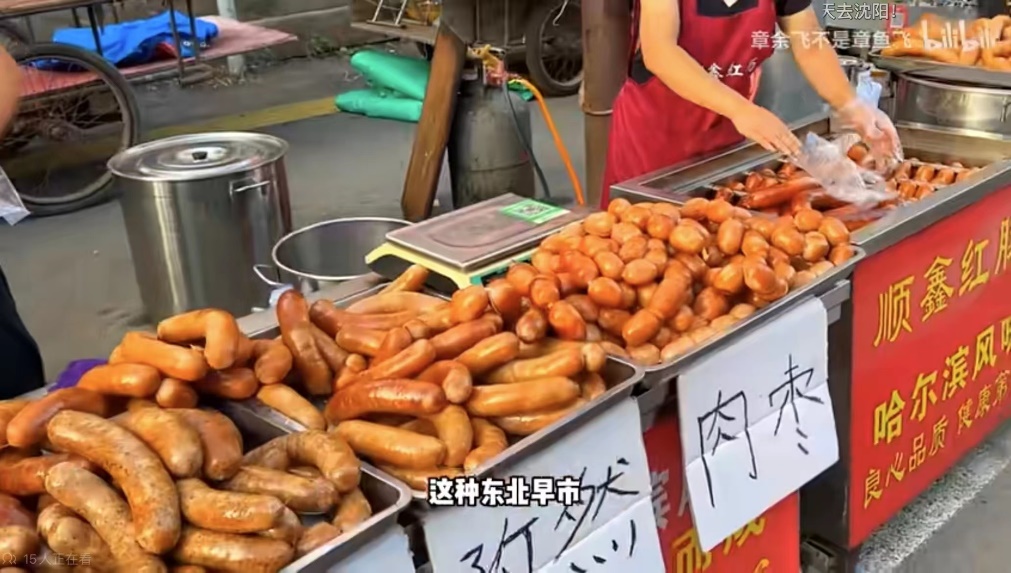 “南方孩子也是第一次来逛东北早市,太好玩了,什么都感觉稀奇,牛肉火勺10块钱15个,看着都是小时候的味道。”UP主“章余飞不是章鱼飞”在今年8月19日发布的一则逛小河沿早市的视频播放量已经达到136.7万,视频中展现出的早市食品种类的售价让观众感到无比新奇。