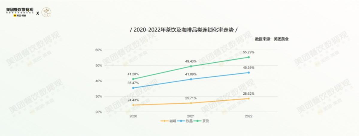 巨头不断攻城略地,留给品牌们大展身手的时间的确不多了。据中国连锁经营协会发布的《2022新茶饮研究报告》显示,2020-2022年新茶饮的连锁化率从41.2%提升到55.2%。在多个城市核心商圈的抽样调查中,新茶饮的连锁化率已超80%。