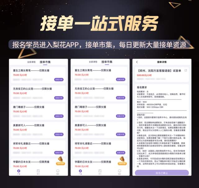 紧接着,最关键的就是体验课上到一半后开始介绍价值几千元的高阶课。这个高阶课程与前面强调的接单变现紧密相关,比如十方教育旗下的梨花APP,就有一个专门的接单广场,不管是写作还是配音,每天都有大量的接单资源提供给学员,且就算毕业了也能在该平台接单。换句话说,想要享有接单变现的福利,就得先成为他们的学员。