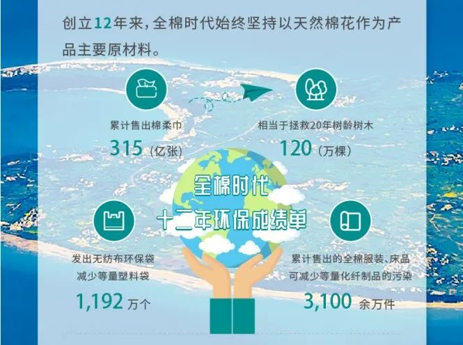 据统计,全球每年棉花的种植量,可以吸收相当于750万辆燃油客运车排放的二氧化碳;1件全棉T恤,从棉花种植过程到成衣环节,整个过程碳排放量为7千克,而1件化纤面料T恤碳排放量则高达47千克。