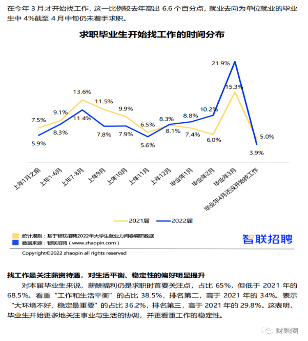 据智联招聘数据显示,对本届毕业生来说,薪酬福利仍是求职时首要关注点,占比65%,低于2021年的68.5%;表示“大环境不好,稳定最重要”的占比36.2%,排名第三,高于2021年的29.8%。由此说明,在以00后为主要的毕业生千万大军中,在就业形势严峻的大环境之下,如何让自身利益得到稳定的保障显得尤为重要。