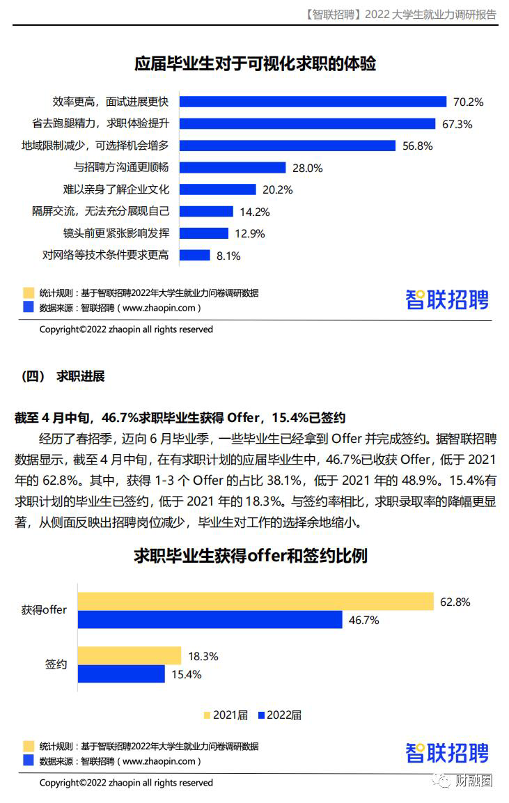 据智联招聘4月26日发布的《2022大学生就业力调研报告》显示,截至4月中旬,46.7%的应届毕业生收到了录用通知,低于2021年的62.8%;有15.4%的应届毕业生签约找到了合适的工作,也低于去年的18.3%。与签约率相比,求职录取率的降幅更显著,从侧面反映出招聘岗位减少,毕业生对工作的选择余地缩小。
